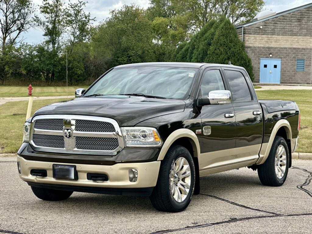 The 5.7-liter Hemi V8 produced 395 horsepower and 410 ft-lbs of torque when new. The truck is finished in two-tone Black Gold Pearl Coat and White Gold Clear Coat. Exterior details include a power-retractable tonneau cover. The seats are trimmed in Cattle Tan leather with black piping, and patches with debossed Laramie Longhorn Edition emblems accent the backrests.